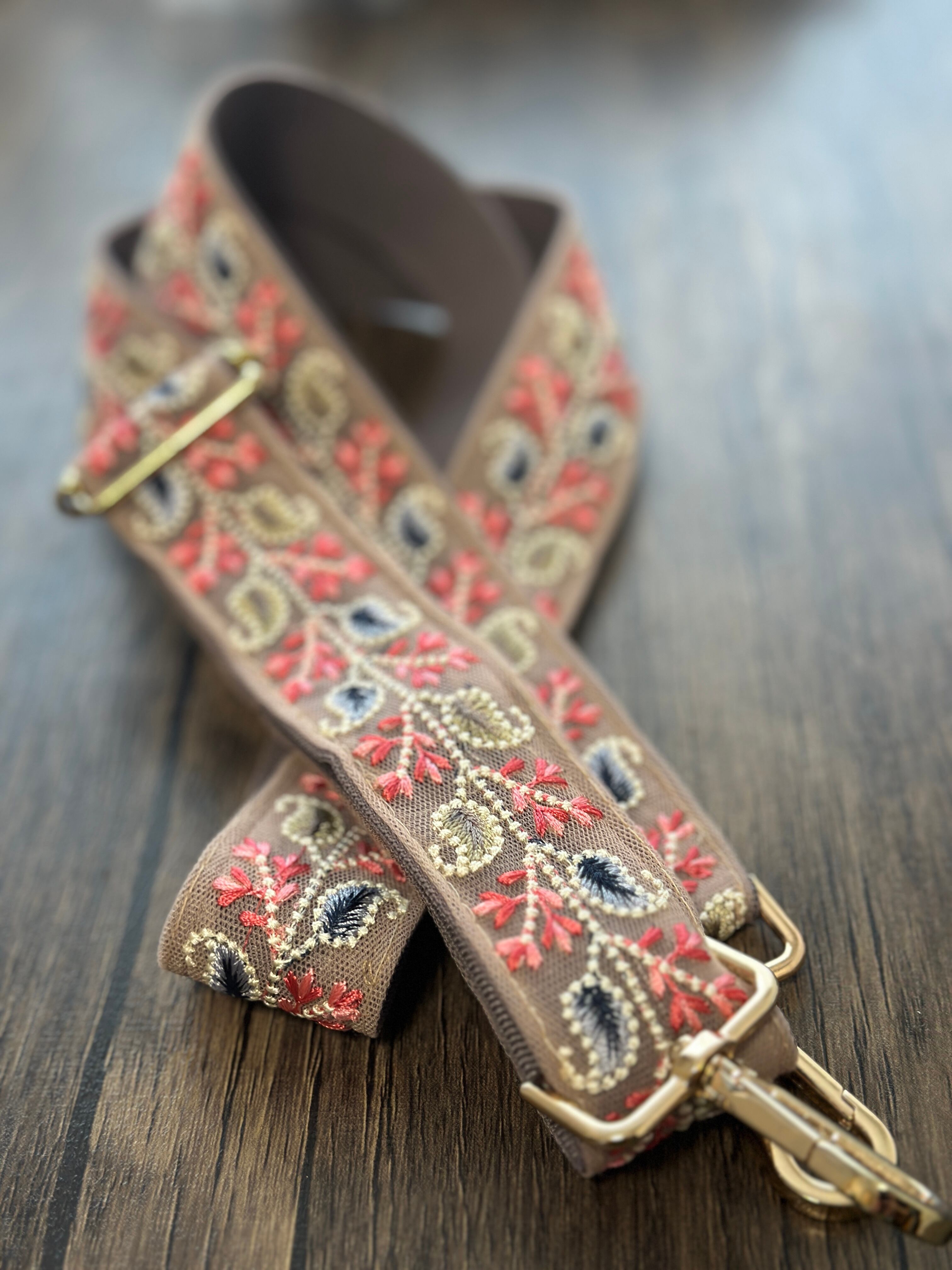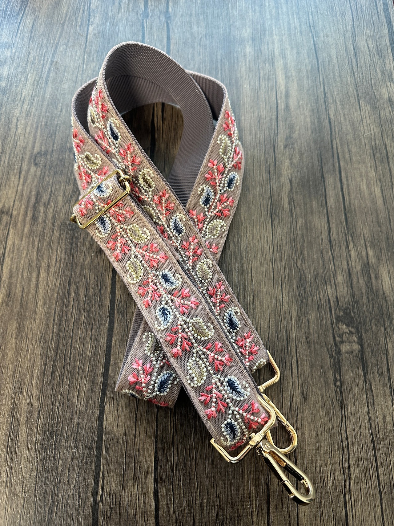 インド刺繍リボンの美しいデザインが際立つスマホショルダーストラップ。赤い花のモチーフが、日常のコーディネートに華やかさを加えます。長さの調節が可能なので、お好みに合わせてぴったりフィット。カバンストラップやカメラストラップとしても利用できる多機能性が魅力です。